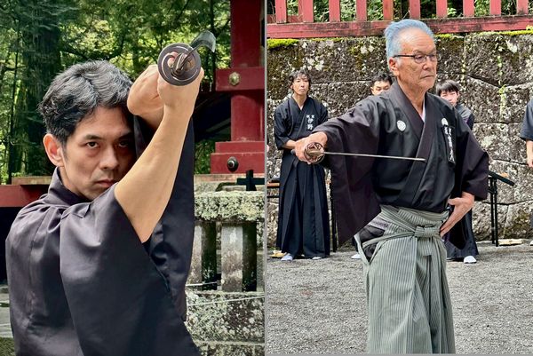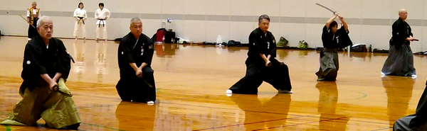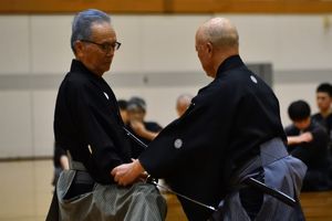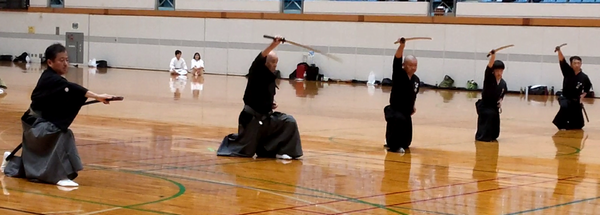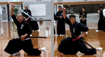 脇差の形は上段者が学ぶもので稽古の時は安全のため木刀で行うが今回は師範同士であるので真剣を用いている。