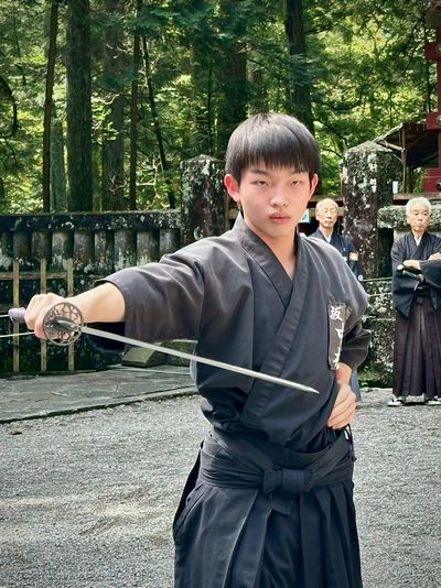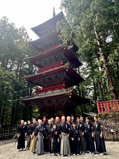 令和5年7月30日、坂東無外会設立15周年という節目の年に、日光東照宮において、奉納演武を行いました。コロナ禍による各種規制も解除され、観光客で賑わう東照宮五重塔前にて、入門数か月の級剣士から、9段宗範まで総勢26名が参加し、各々の思いを胸に、力強く演武を奉納しました。