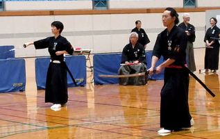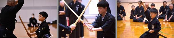 剣術は、互いに剣を交える実戦的なもので、一人で行う形の稽古とは違い、相手の動きを意識し、間合い、体捌きを鍛錬します。互いの剣と気がぶつかり合い、迫力ある演武です。