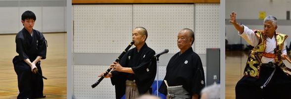 剣武では、尺八・吟士両師範による吟詠に合わせて、居合の形を演武します。吟題は徳川に因み、「水戸光圀 日本刀を詠ず」。この詩は、日本刀を龍にたとえ、武士道精神を詠じた詩です。尺八の伴奏が響き、詩が歌われる中、形を演武する様は、普段は味わえない独特な趣を感じられます。