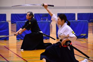 写真は短刀取り 相手が短刀で襲ってきたとき投げて押さえ込んだ状態講座に参加していただいた皆様に実際に居合の基本となる刀の操法を実感していただくために模擬刀を腰に帯びていただき刀を振ってもらいました。